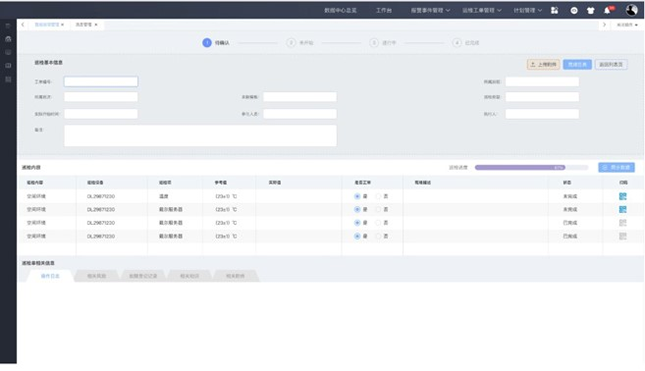 運(yùn)維管理系統(tǒng)具備包括我的工單、故障工單、巡檢工單、保養(yǎng)工單等功能,為機(jī)房日常運(yùn)維過(guò)程工作提供電子化、標(biāo)準(zhǔn)化的日常工作模式,用戶通過(guò)系統(tǒng)可以制定巡檢計(jì)劃、巡檢內(nèi)容、執(zhí)行巡檢任務(wù),進(jìn)行巡檢工作的規(guī)范化管理。